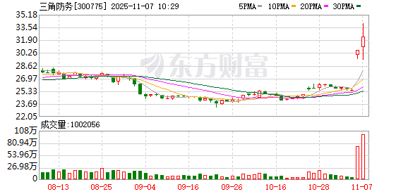 数据宝统计,截至09:51,三角防务成交额24.03亿元,创2024年5月13日以来新高。最新股价上涨9.32%,换手率14.34%。上一交易日该股全天成交额为22.18亿元。(数据宝)